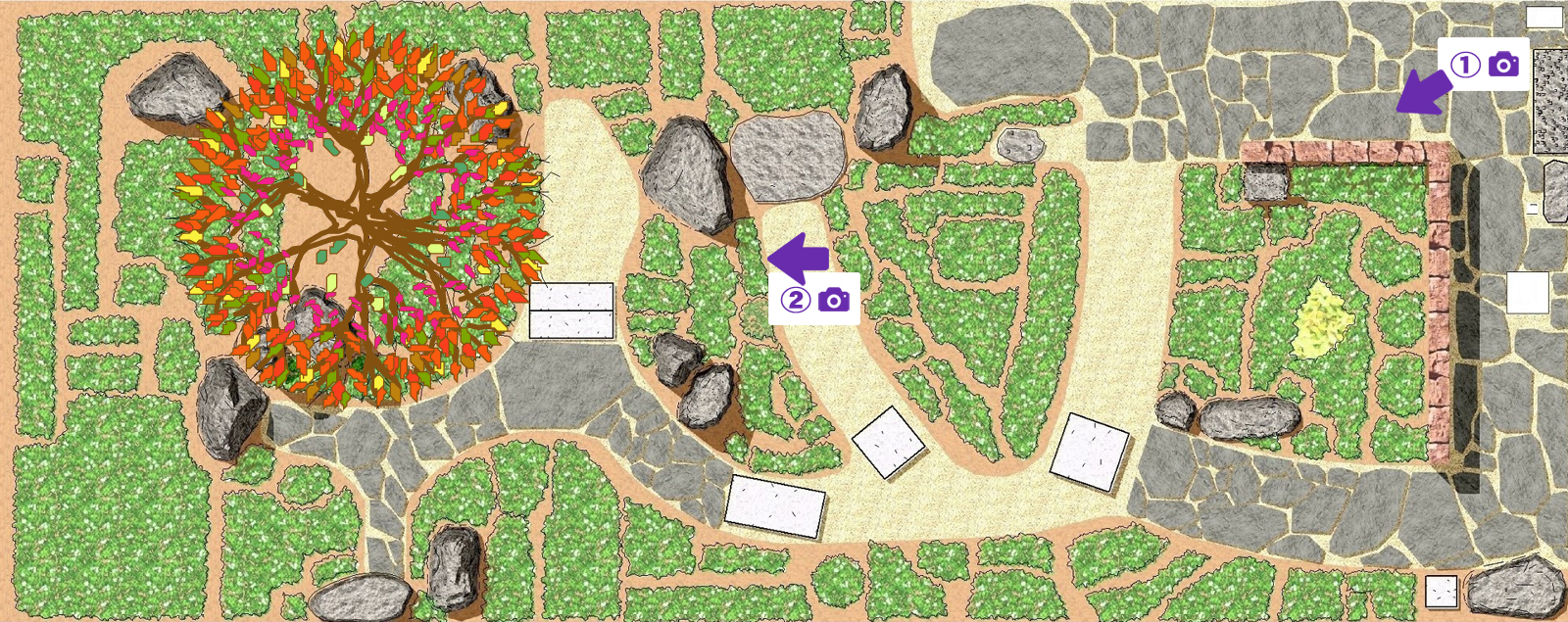 - 中庭:クガイソウ、オニユリ、アスチルベ、バラ、キリンソウ、スモークツリー、ギボウシ、サルビア、曲がりヤマモミジ
